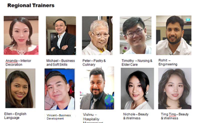 Regional Trainers Singapore Vincent – Business Development Vishnu – Hospitality Management Rohit – Engineering Trainer Amanda -Interior Decoration Trainer Michael – Business Trainer Peter – Pastry Chef Trainer Timothy – Nursing Trainer Ellen – English Language Trainer Katherine – Beauty Trainer Nichole – Beauty & Wellness Trainer Ting Ting – Beauty and Wellness Trainer